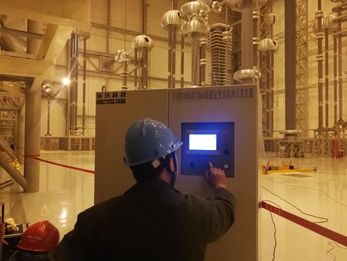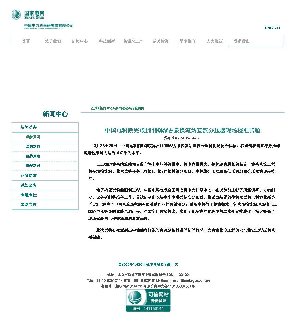 由我公司提供的ZGW 1200kV/10mA高穩(wěn)定度直流高壓發(fā)生器及HV2-1200kV高精度直流標(biāo)準(zhǔn)分壓器兩套裝置完成了±1100千伏古泉換流站極1、極2母線1100千伏直流互感器的全電壓誤差檢驗(yàn),此為國際上首次開展該電壓等級的直流互感器的現(xiàn)場校驗(yàn)。下附相關(guān)新聞媒體報(bào)道: