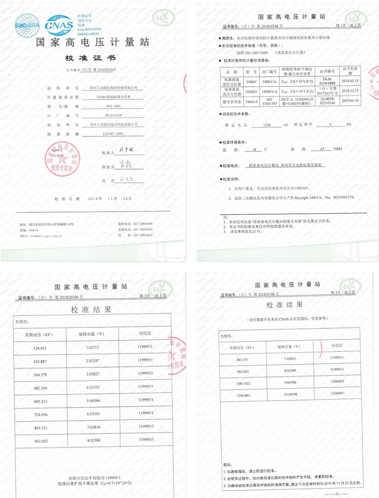 HV2-1200kV高精度直流標(biāo)準(zhǔn)分壓器國家高電壓計(jì)量站校準(zhǔn)證書