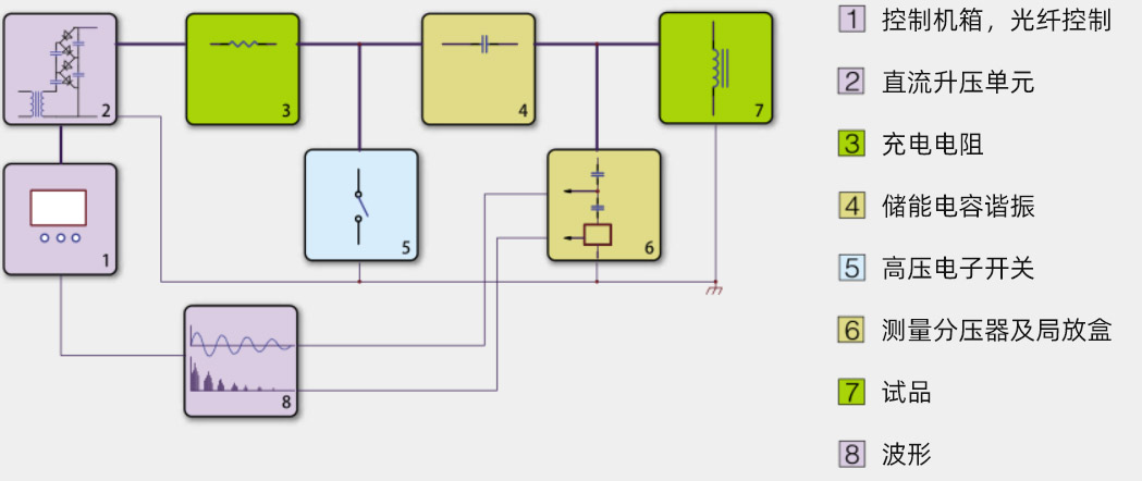 測試原理:由中頻倍壓回路產(chǎn)生直流高壓,經(jīng)過充電電阻對儲能電容和干式電抗器進行充電,達到試驗電壓后,啟動高壓電子開關(guān)進行放電,充電電容(C)和干式電抗器(Lx)諧振,形成衰減振蕩,測量振蕩頻率、衰減率和局放量,判斷干式電抗器是否有絕緣缺陷;